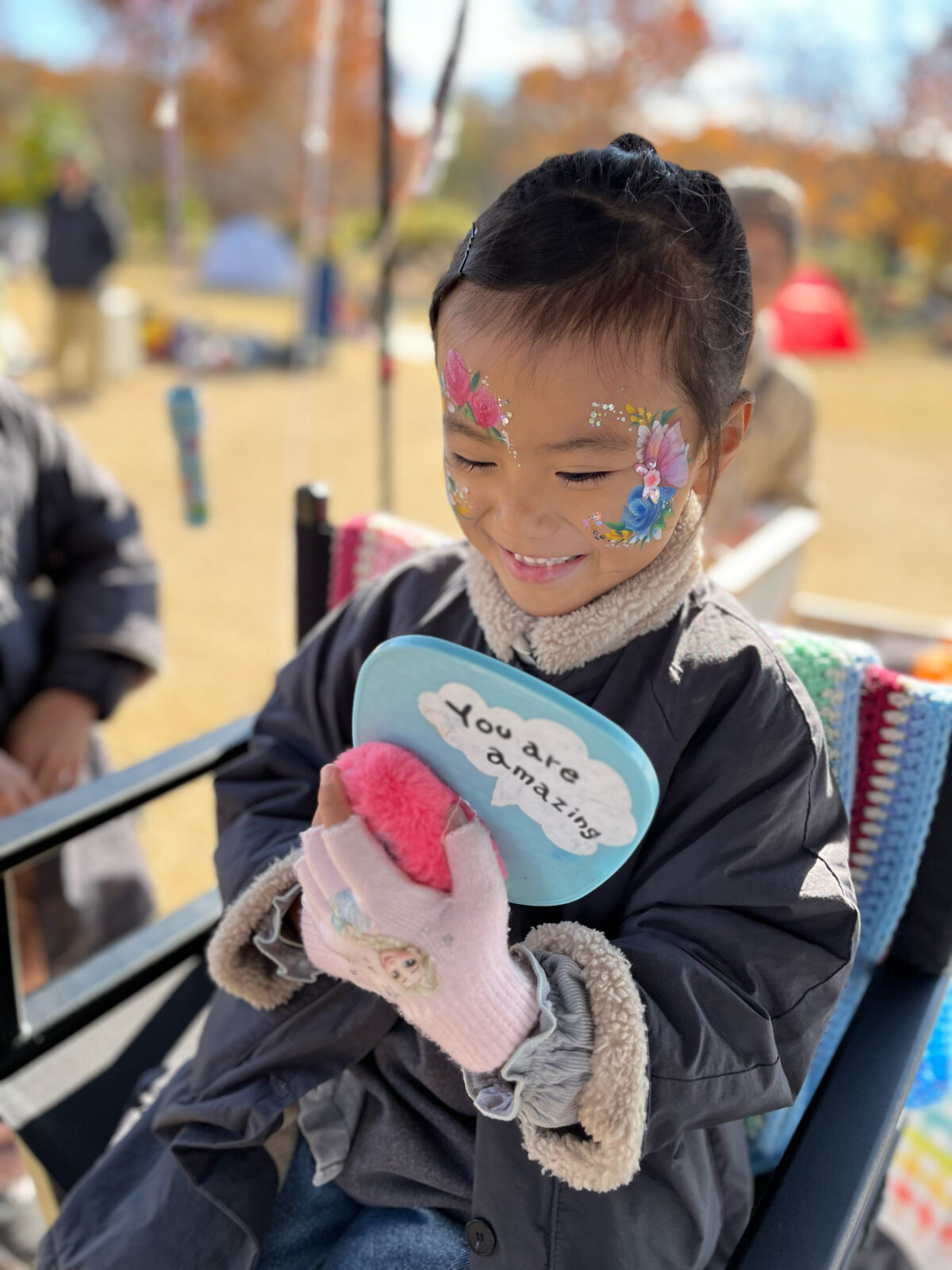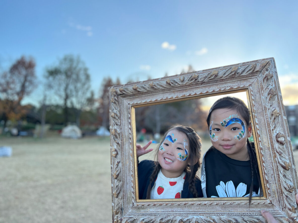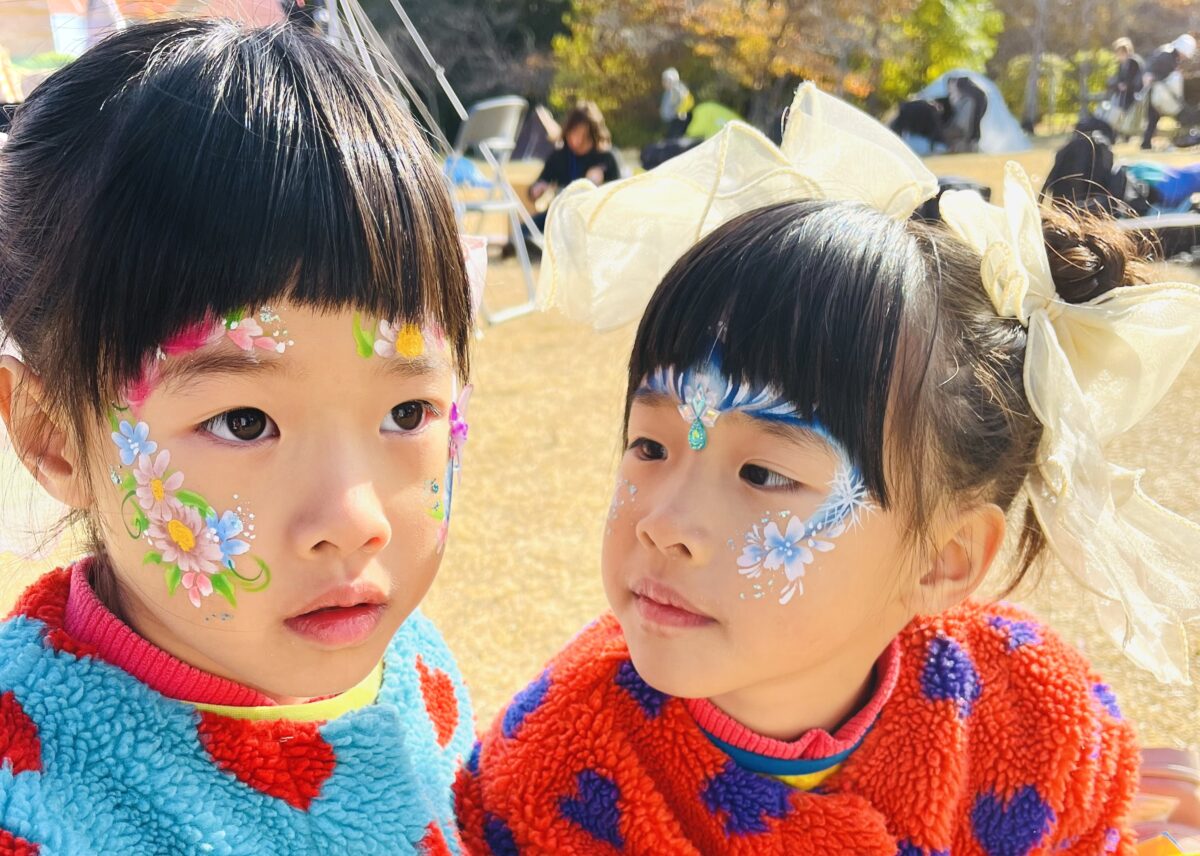 「お花畑」ほっぺショップお得意のフラワーペイントは、寒い冬の公園でもバッチリ映える鮮やかな色合い。鏡をのぞくと思わずにっこり!