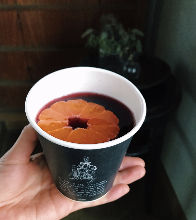 「みかんゴロッとホットワイン」スパイスの力で身体の芯からじんわり温めるホットワイン。