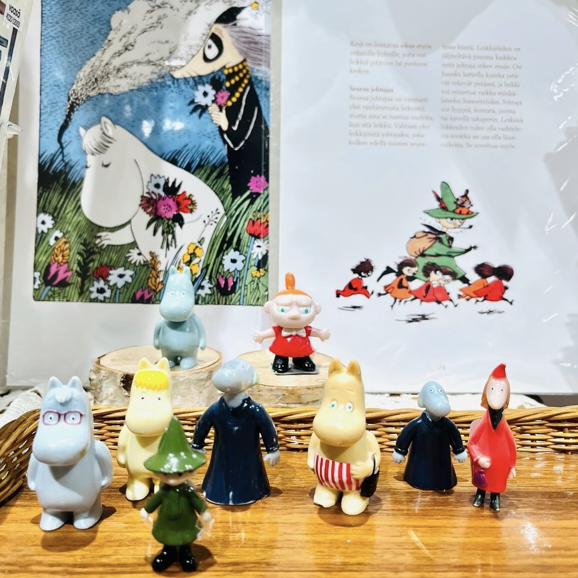 「ムーミン」フィギュアやポストカードなど様々なムーミンたちです。