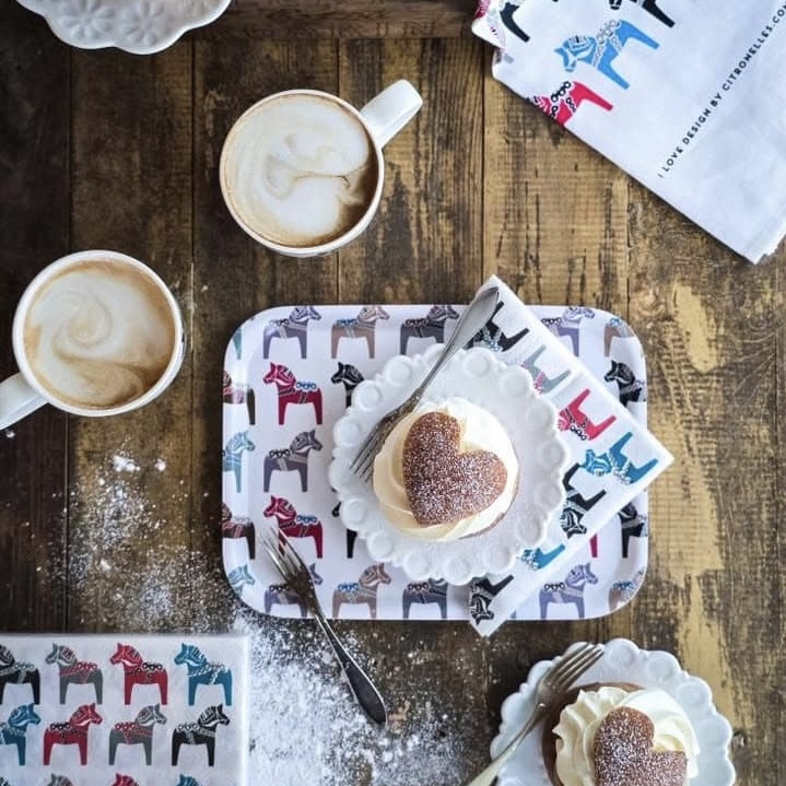 「ジェリールーペ・トレイ&コースター」北欧の妖精:トムテが描かれた、スウェーデン製の白樺で作られたテーブルウェア。