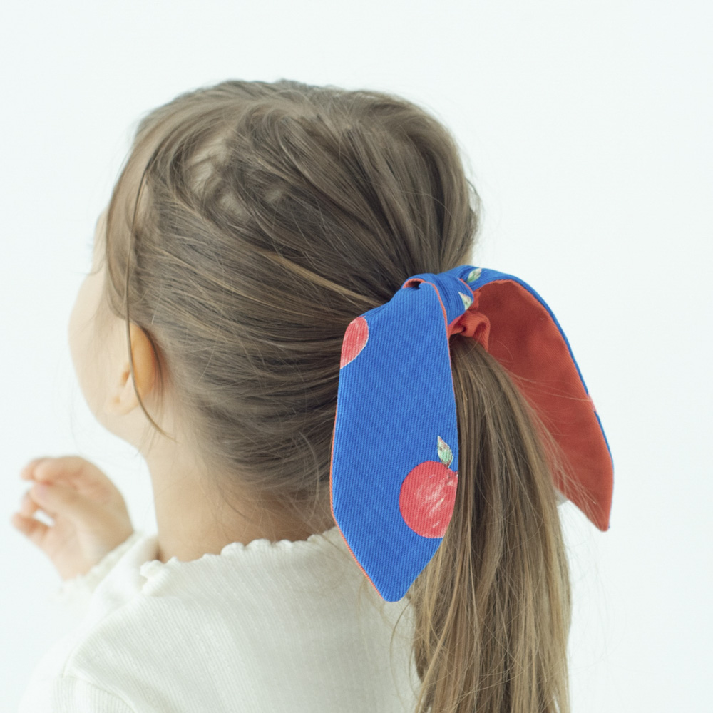 「リボンシュシュ」表に柄、裏には無地を組み合わせ。着けたときにウサギの耳のように垂れるデザインが特徴