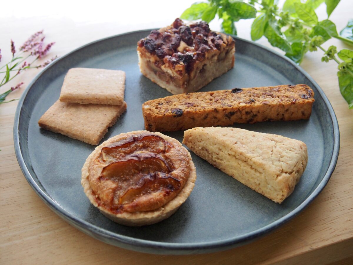 お菓子はすべて、小麦・卵・乳製品を使わず植物性素材を使用。米粉や玄米粉を主原料に、米油やココナッツオイルなどの植物油、メープルシロップや甜菜糖などの甘みで仕上げた穏やかなおやつたちです。お召し上がりくださる方の、体と心にやさしく寄り添えるようなおやつを思いながら、日々手を動かしています。ほっとできる、冬のお茶時間のお供にしていただけましたら幸いです。