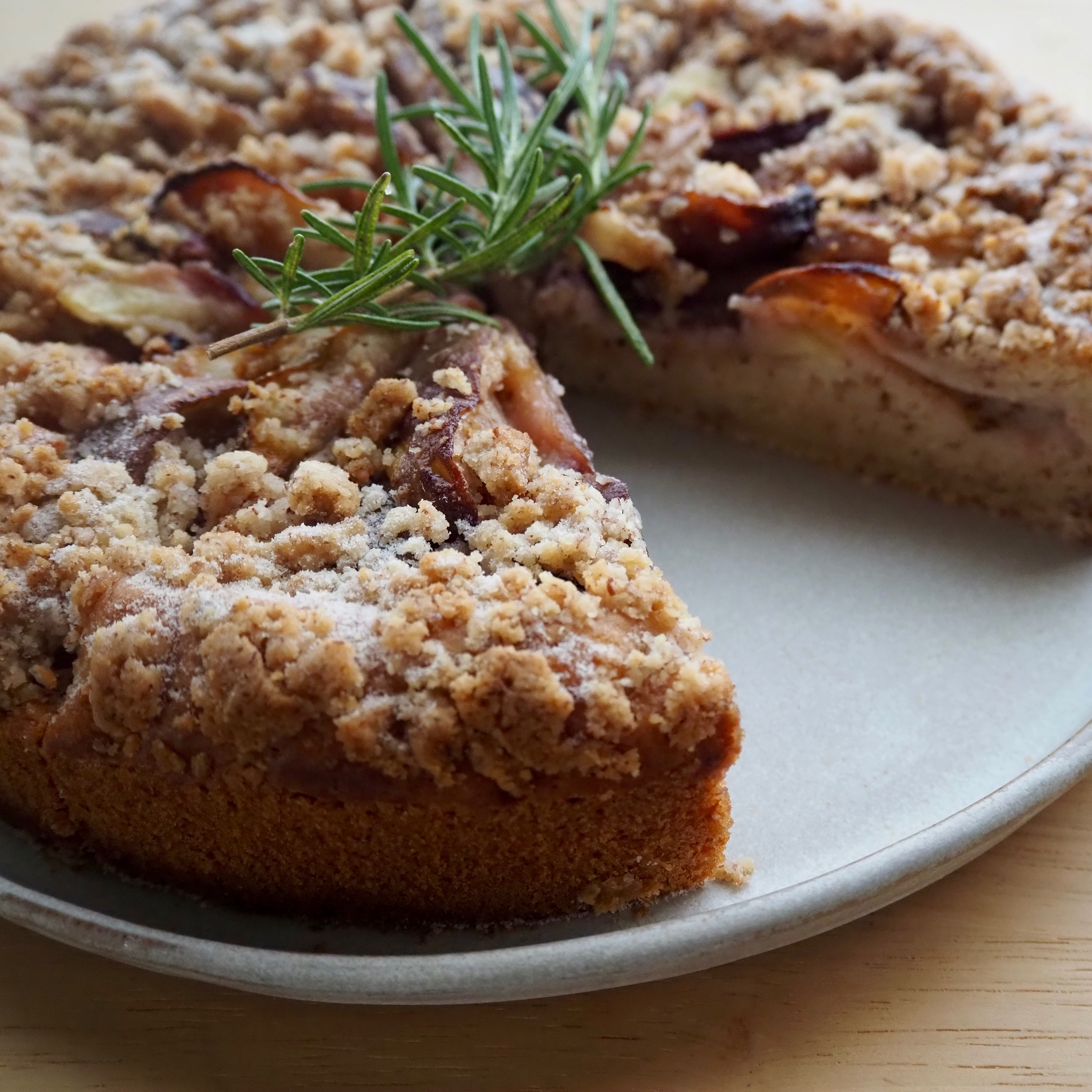 「季節のクランブルケーキ」季節毎に出会う新鮮な果物をたっぷり使ったクランブルケーキ。もっちりした米粉生地に、甘酸っぱい果実と少し塩気を感じるクランブルがなじみます。