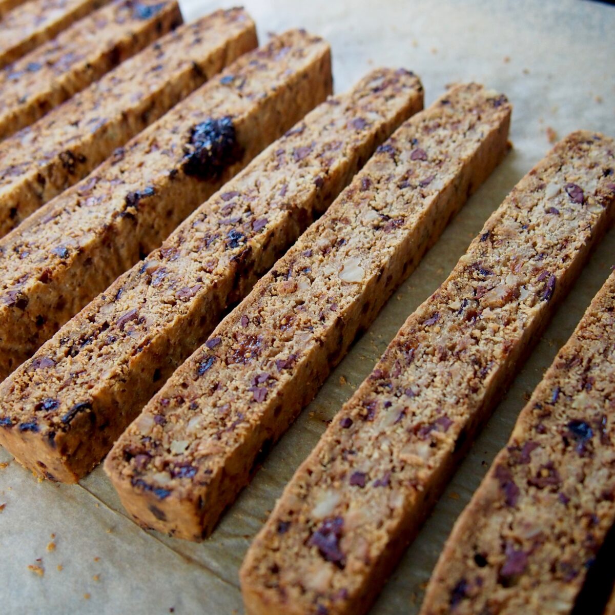 「カカオニブビスコッティ」カカオニブのカリッとした食感やくるみの歯ごたえ、ドライフルーツのやさしい甘みなど、色んな味わいを一口で楽しめる具だくさんなビスコッティです。
