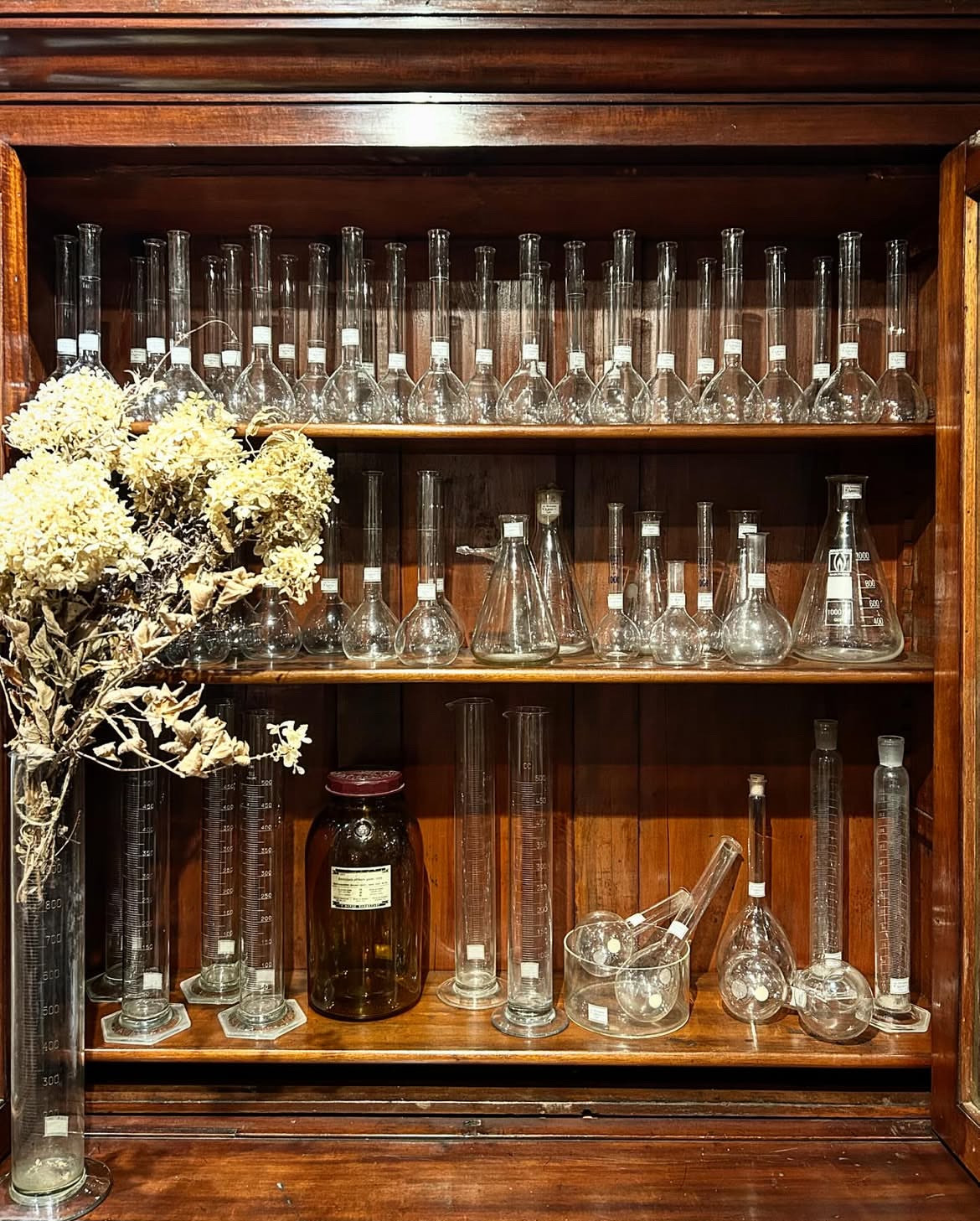 「ヴィンテージの実験器具」フラスコやビーカーなどのガラス製実験器具各種。