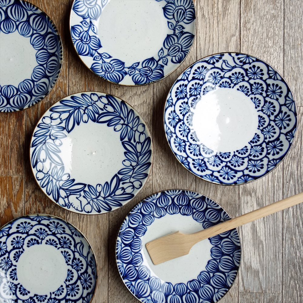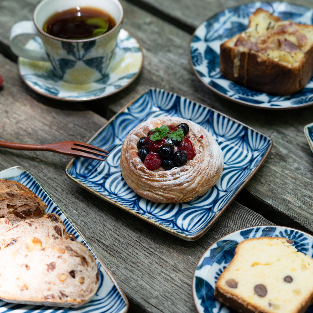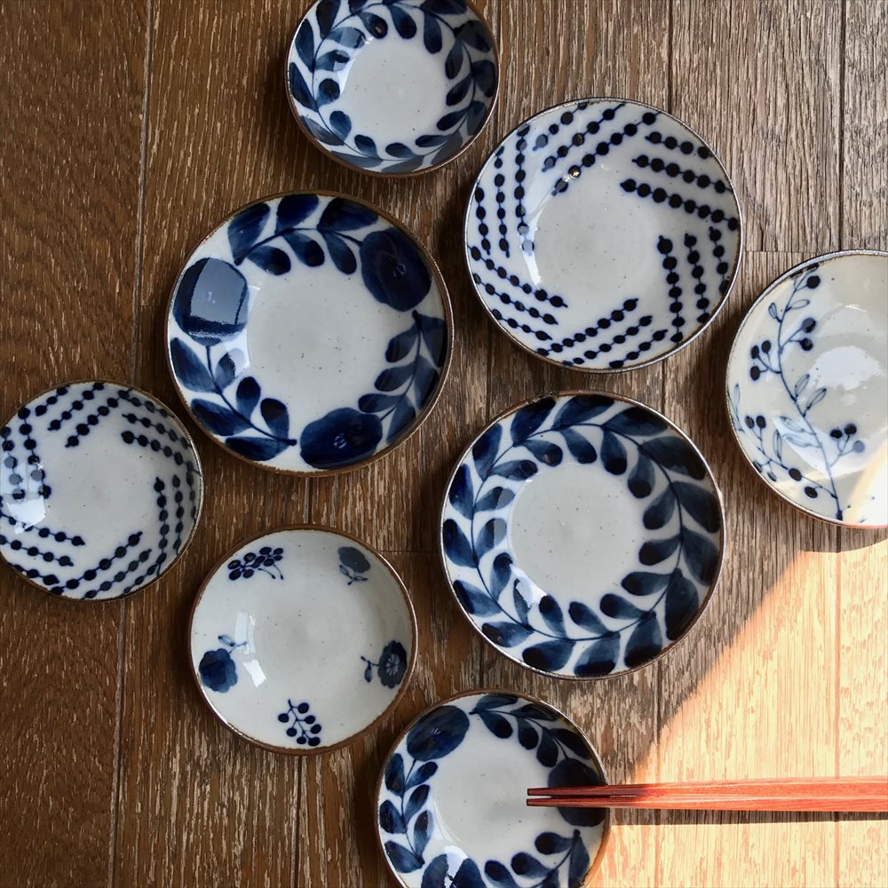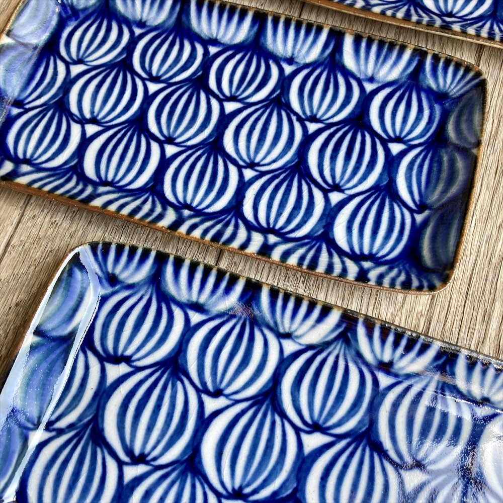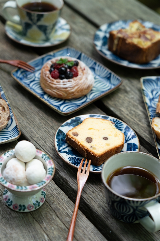 関西蚤の市には2023年の第7回以来2度目の出店となります「キカキカク」です。土練りから絵付け・焼成まで、全て手作りで夫婦でコツコツ制作しています。染付けという伝統的な技法なのですが、現在の食卓にもなじむ形と色を心がけています。ガス窯にて還元焼成という方法で30時間近くたっぷりと焼成し、それによりしっとりとした質感・クリアな色味・丈夫な生地に焼きあげています。