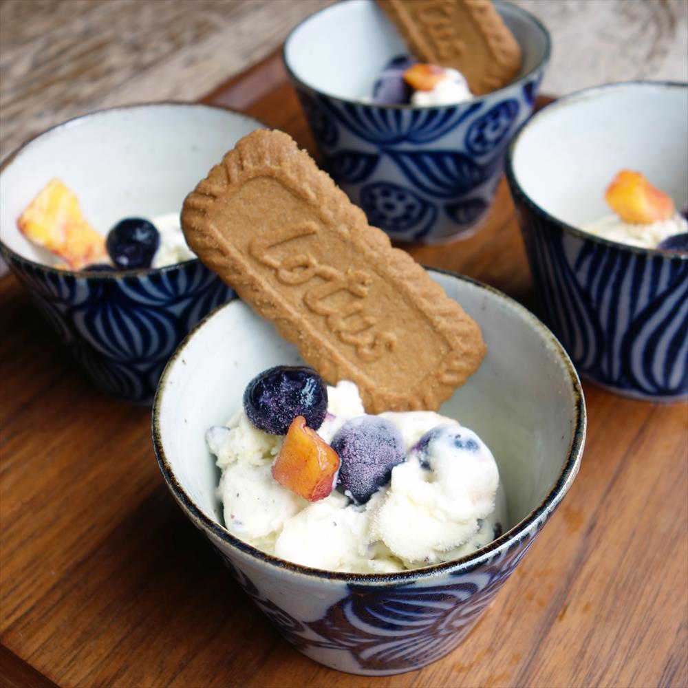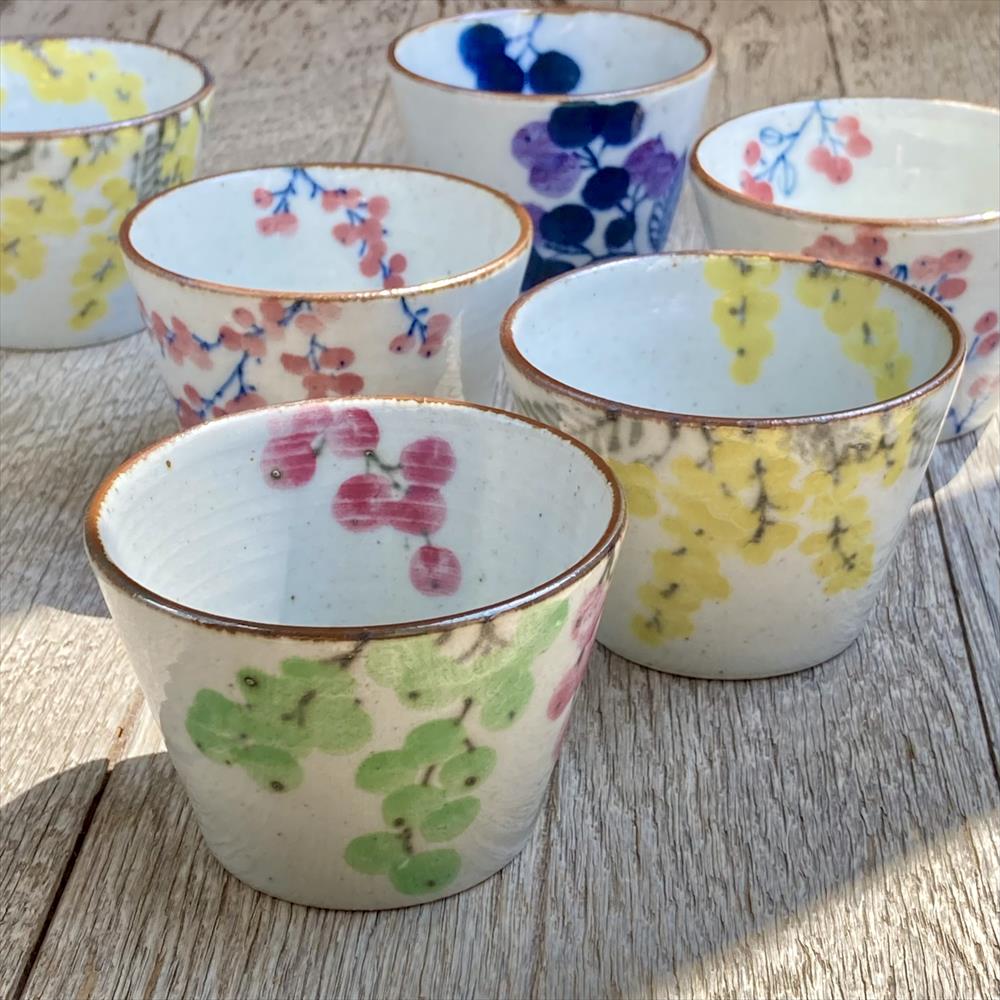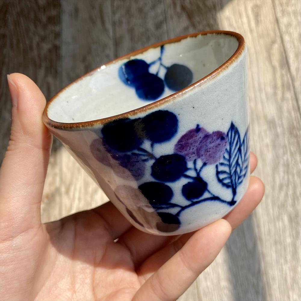 「ブルーベリー柄のそばちょこ」カラフルな色味に気分が上がる器です。
