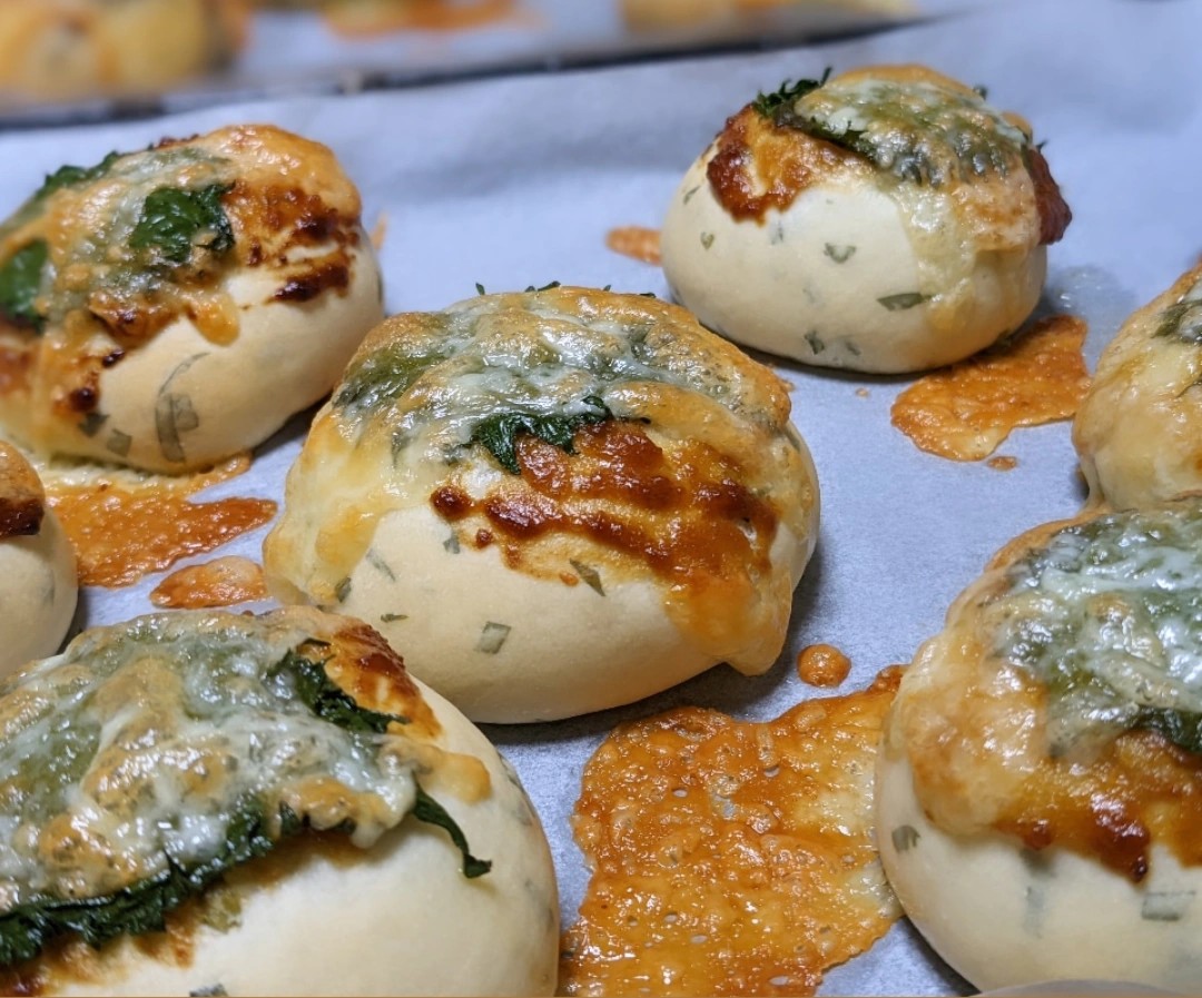 「大葉味噌マヨチーズ」大葉を混ぜ込んだ生地に自家製味噌、無添加マヨ、大葉、セルロース不使用チーズをトッピング! リピート率高い人気の限定パン。