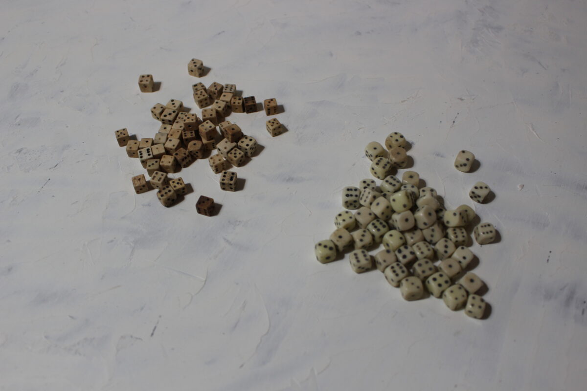 フランス骨、陶器ダイス。1800年代後半から1900年代初期。とても小さいです。形も数字配置も不規則で手作り。
