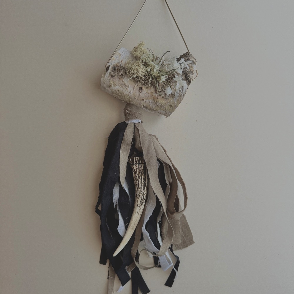 「霞む森の恵み」という白樺と小さな鹿の角が特徴の壁飾り。
