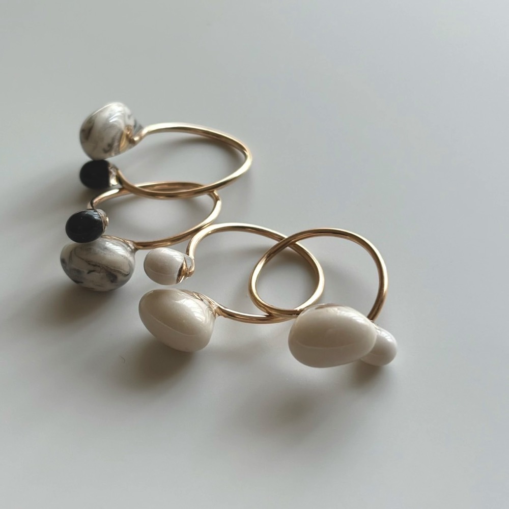 植物の「白花豆とユーカリの実」に真珠のパウダーと墨をつかって色付けされたリング