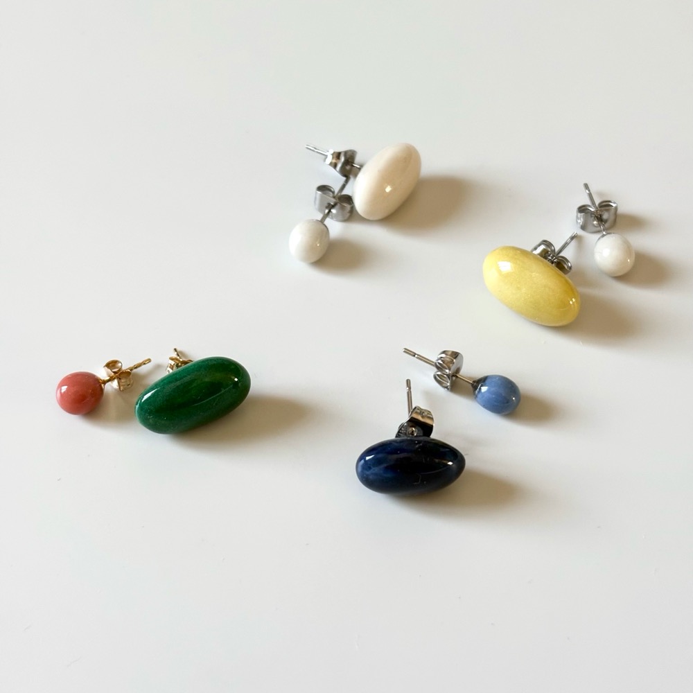 植物の「白隠元とユーカリの実」を粉末にしたラピスラズリや貝などの天然の顔料で色付けをしたピアスとイヤリング