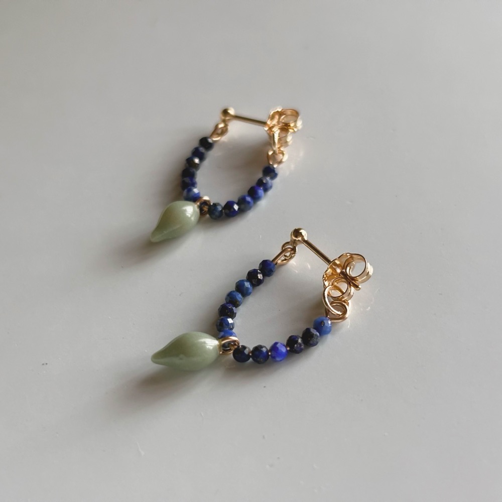 真珠のパウダーや鉱石を粉状にしたものなどの天然の顔料で色付けをした、植物の「ユーカリの実」に、ラピスラズリなどの天然石のビーズを組み合わせたピアス