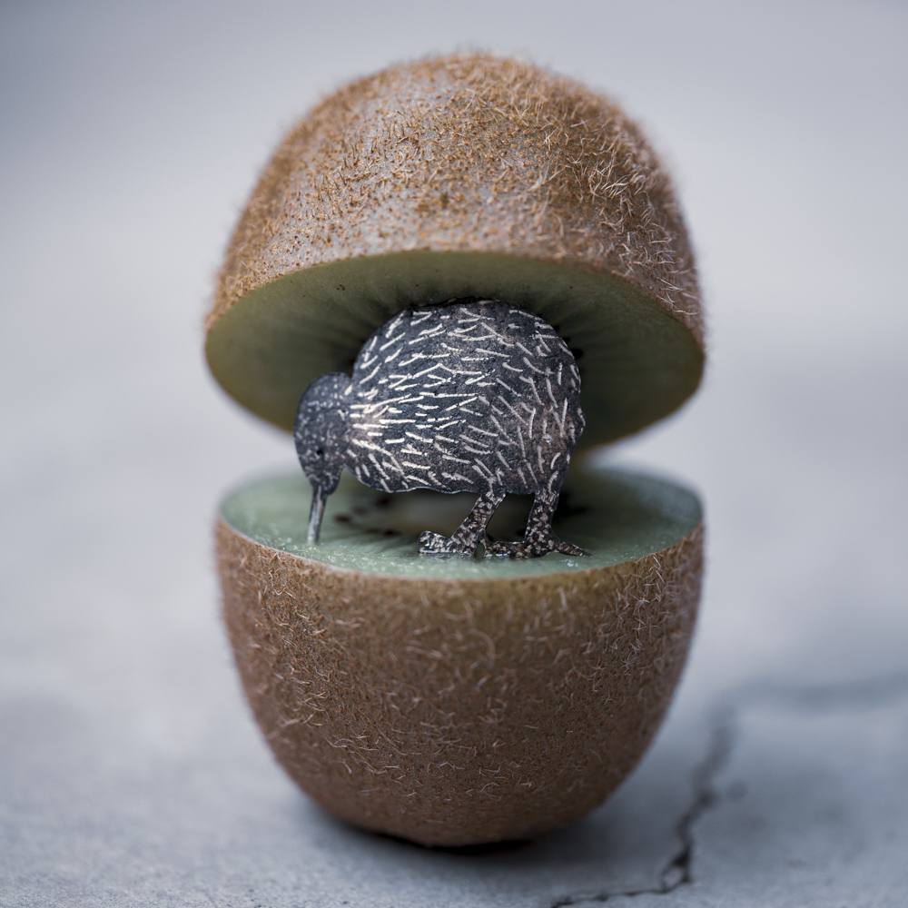 「キーウィ」ころんと丸い飛べない鳥。ボサボサした羽毛が輝くブローチ。