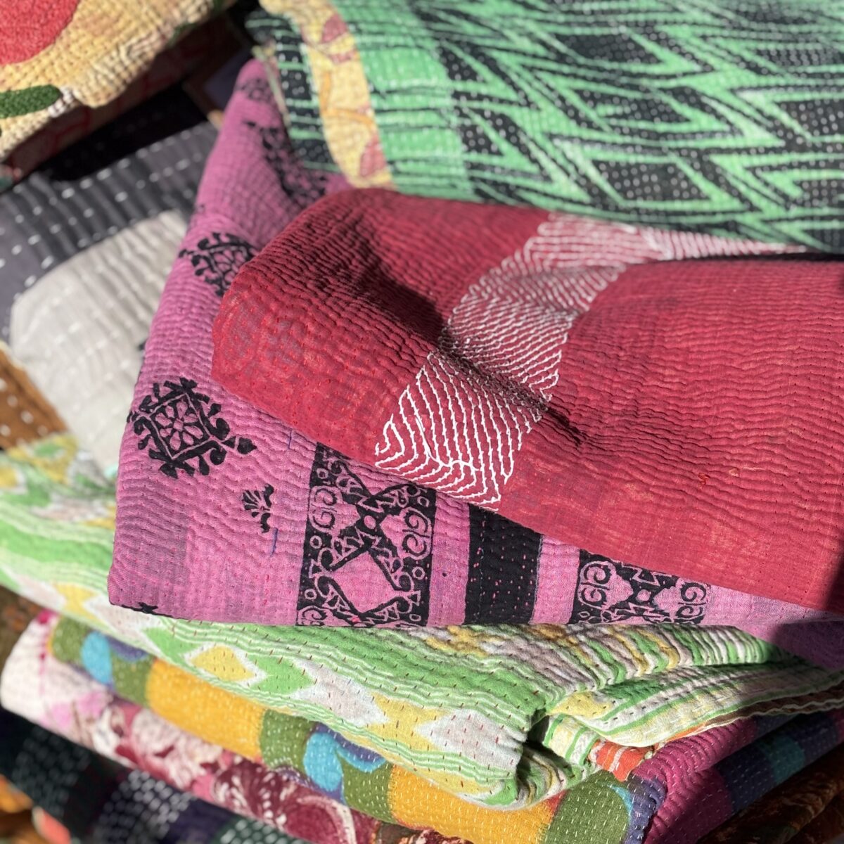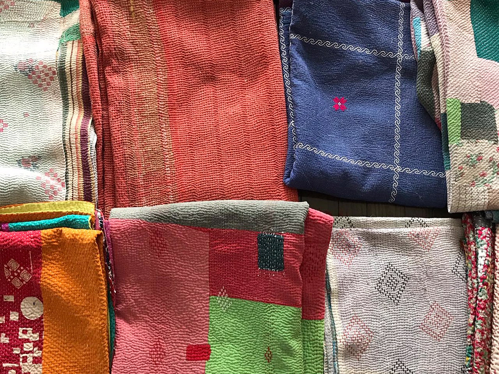 「オールドラリーキルト」 使われていた布を幾重にも重ねて刺し子したキルト。ラグのように使ったり、ソファやベッドにかけて。