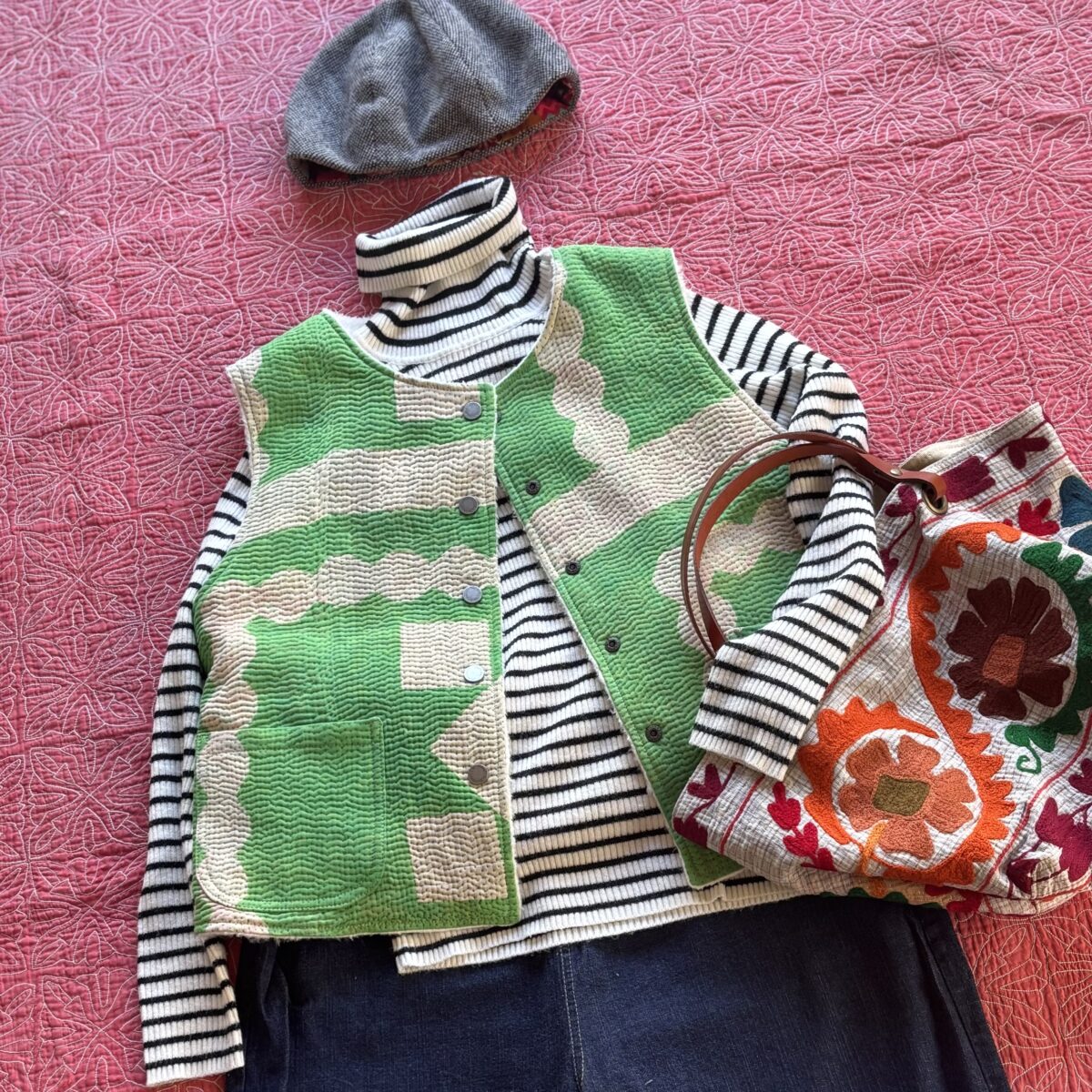 絵のような刺繍が愛らしい“ノクシカタ”をどうやって刺繍したの? と驚きの「ラバリ刺繍」シルクに細かく刺繍した「シルクカンタ」。嫁入り支度として母親が娘のために作ったという「ラリーキルト」 まだまだ手仕事の残るインド。素晴らしい手仕事を堪能できる様々な布で、洋服やバッグ、小物を企画制作しています。秋冬にむけて刺し子のジャケットやベスト、パンツをご用意しています。