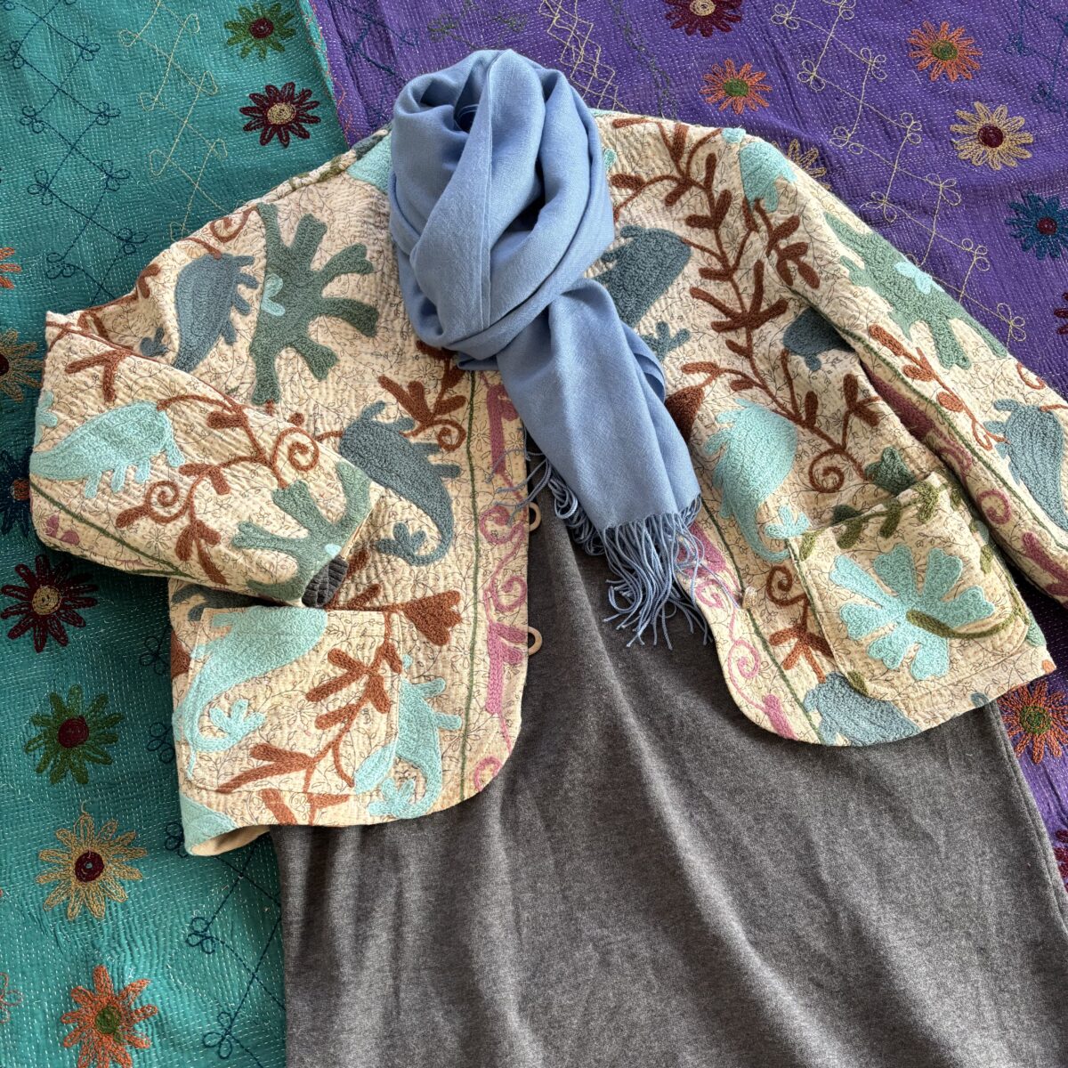 「オールドスザニカンタジャケット」ラリーキルトにスザニ刺繍を重ねたジャケット。ぷっくりとした刺繍は温もりがあります。