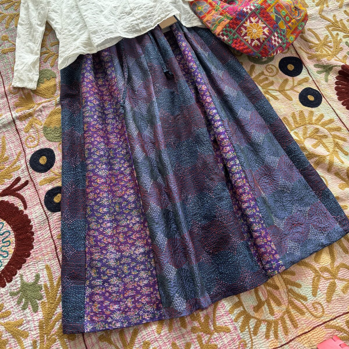 「シルクカンタの12枚スカート」シルクに刺し子した布を12枚繋いだスカート。
