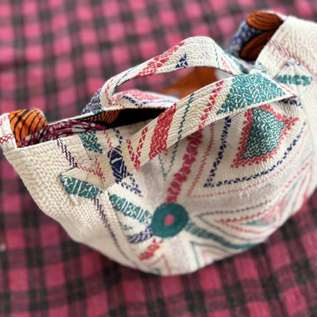 「インド古布のバッグ」インドの手仕事が詰まった布でバッグを作っています。二つとして同じもののないユニークで美しい手仕事が魅力。