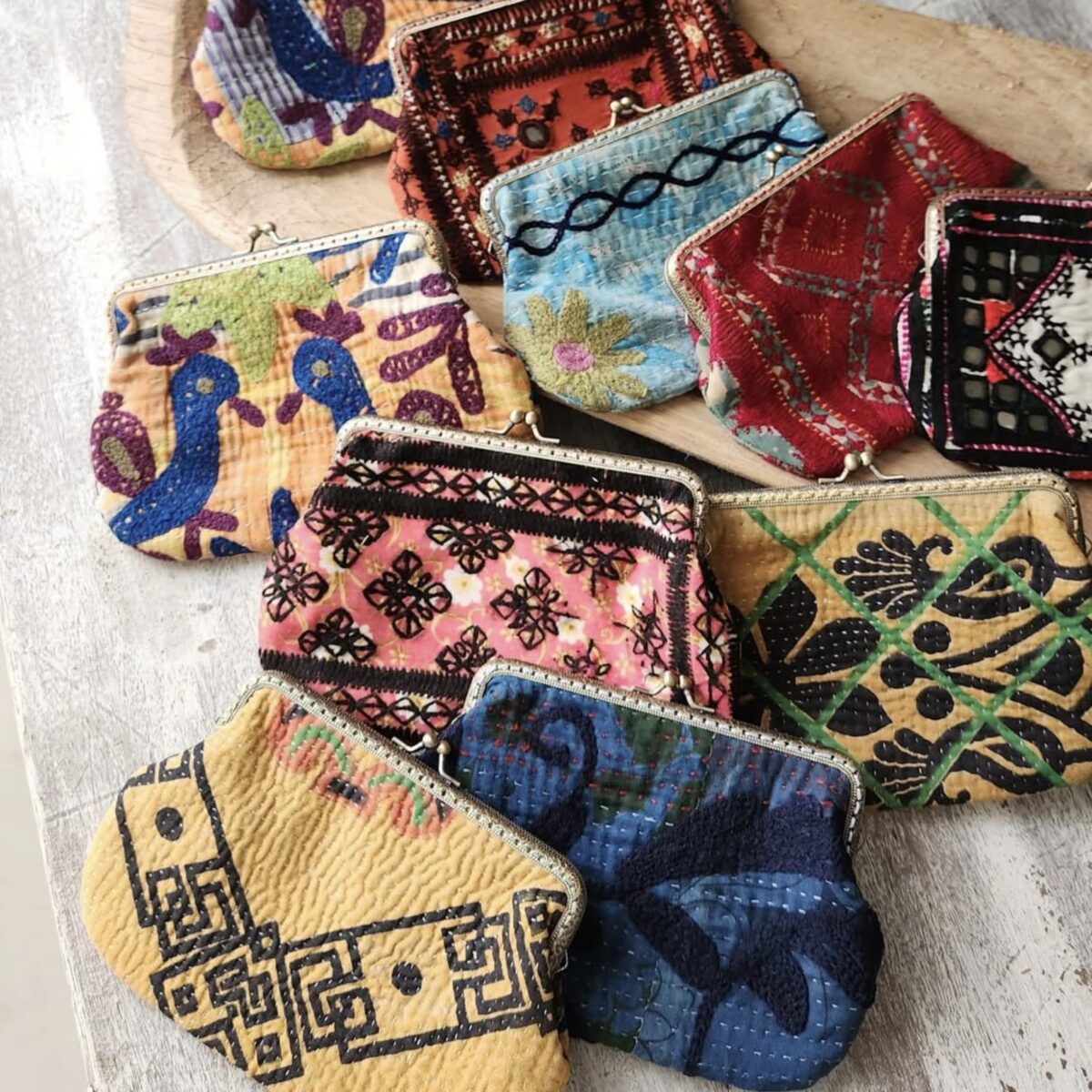 「刺繍古布のポーチ」沢山の刺繍布から美しいところをカットしたポーチは手のひらに入る小さなアート。持っているだけでシアワセな気持ちになれます。