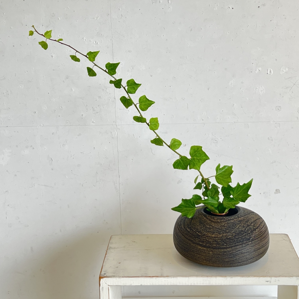 「壁掛け花器(板)」味わい深いケヤキの板に銅の容器を掛けています。