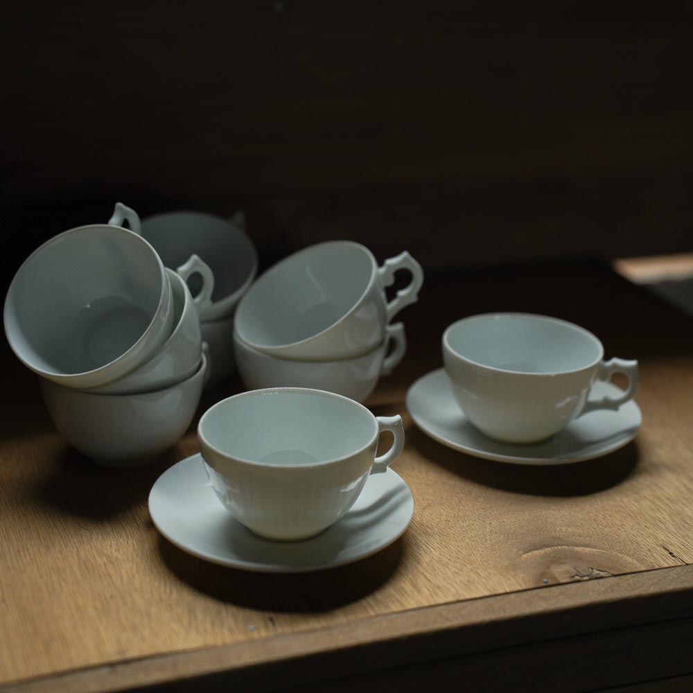 「カップアンドソーサー」1960年代、アメリカへの譲渡品として生産された白磁のカップアンドソーサー。光の当て方で見えてくる、控えめに施された縞模様が美しい一品です。