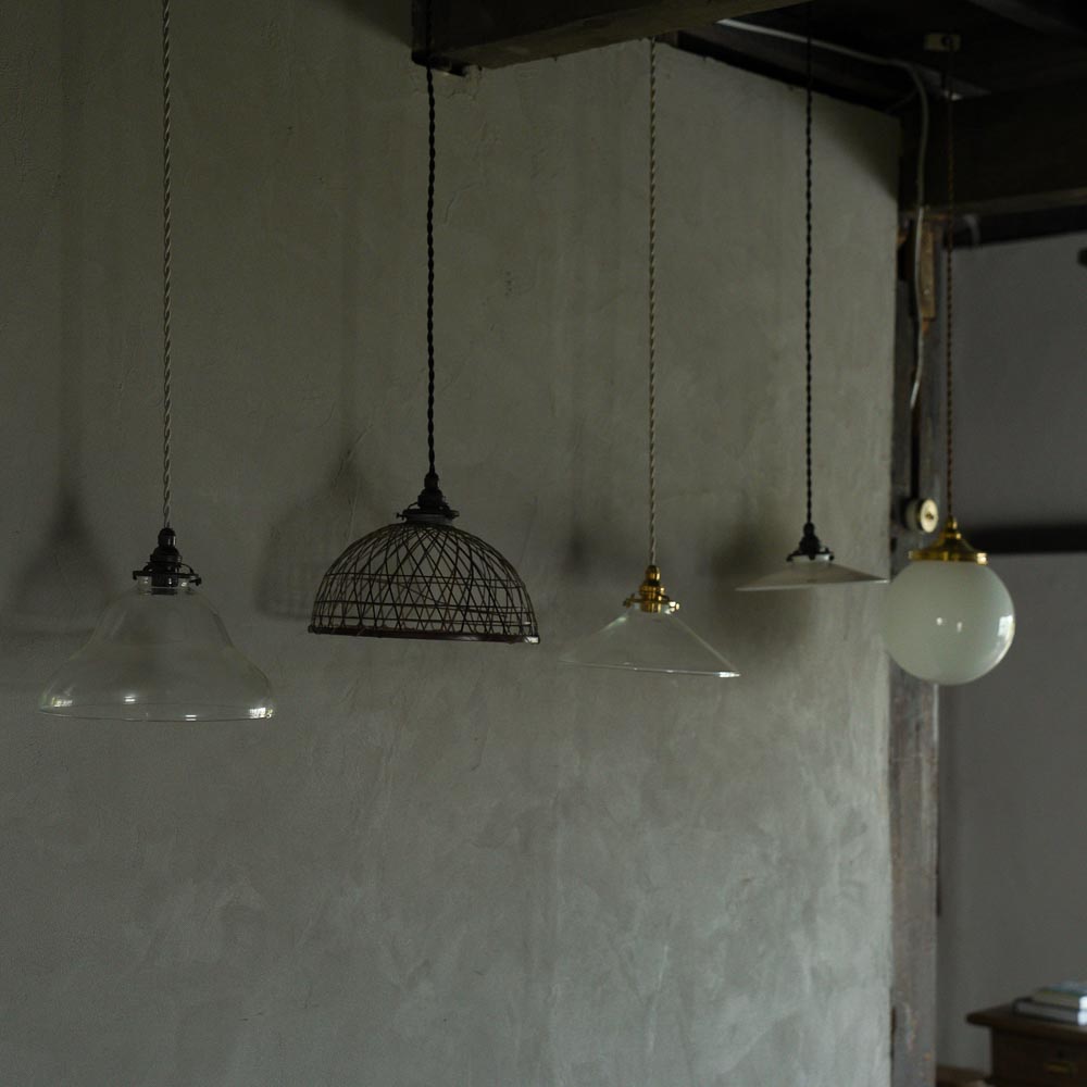 「ペンダントライト」古い電笠を使い、現代のシーリングライトとしてご使用いただける形に作り変えています。乳白ガラス、竹、陶器など素材も様々。