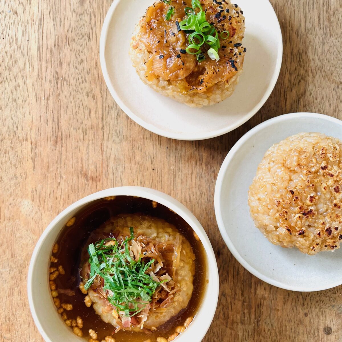 「焼きおにぎり」もちプチ食感の玄米おにぎりを、焼きおにぎりに。お茶をかければおいしい焼きおにぎり茶漬けに変身。日曜日のみ登場します。