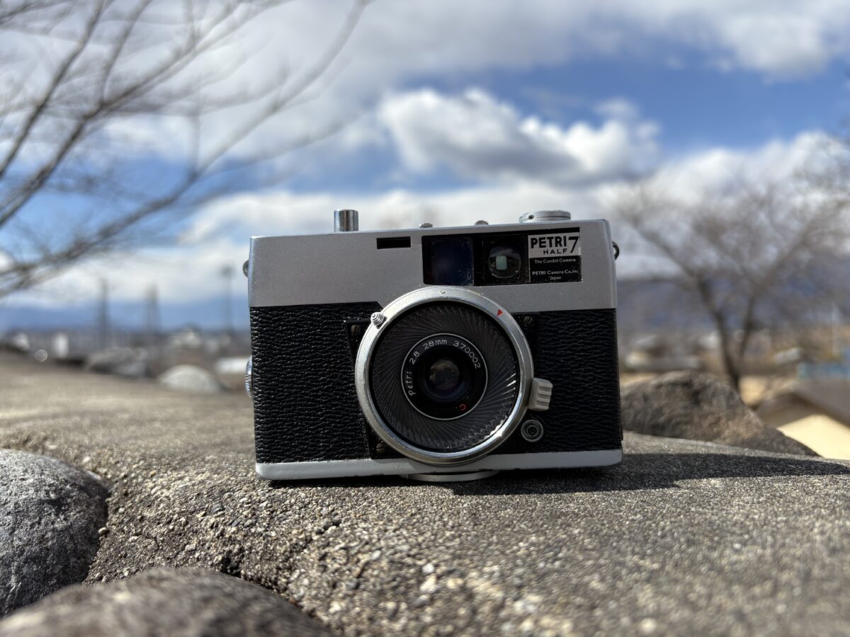 「ペトリハーフ」未来を感じさせるデザインのハーフサイズカメラです。