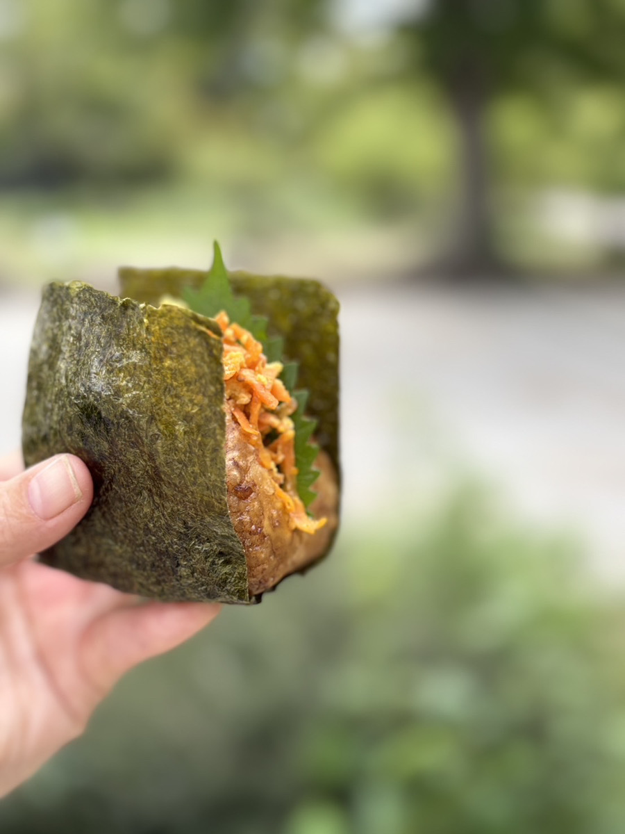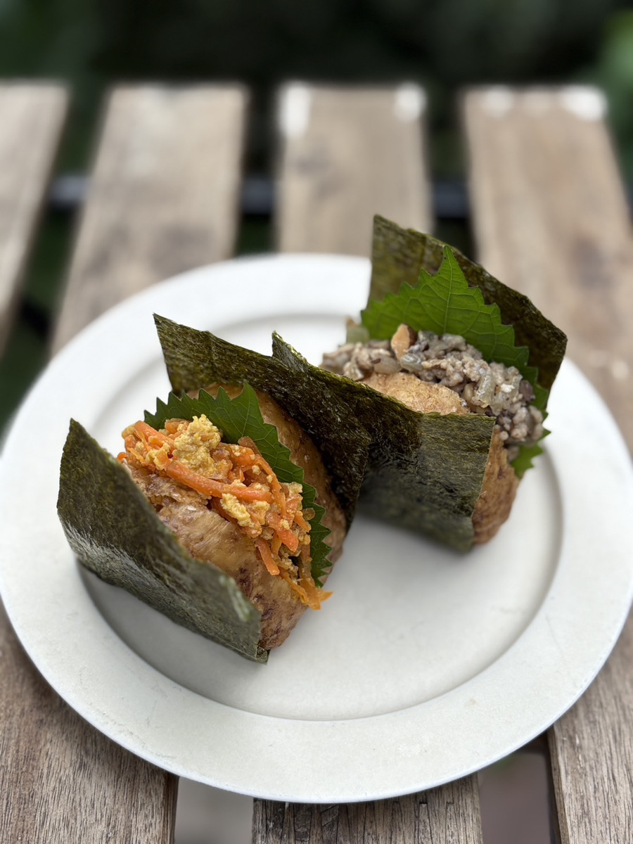 おにぎりバーガーは「豚ミンチのスパイス炒め」「人参シリシリ」の2種の具材をお持ちいたします。
