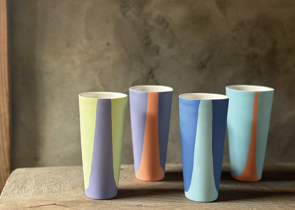 栃木県宇都宮市にて「泥漿(でいしょう)」と呼ばれる液体状にした粘土を石膏型に流し込む鋳込みの技法を中心にカラフルな作品を制作しています。食器や花器をはじめ、くだものや野菜をモチーフにした器や、ヘアゴム、ブローチ等のアクセサリーやオブジェまで。様々なアプローチで陶磁器の可能性を探りながら制作しています。薄手の器はとても繊細な口当たりに仕上げている為、スッキリと気持ち良くビールや炭酸水を流し込めるようにしてあります。また、ポップな色合いの酒器はお酒の時間を華やかで楽しいものにしてくれるはず。器を使う時間だけでなく、使用しない時でも器が置いてあるだけで空間が華やかになるような。そんなもの作りを心がけています。