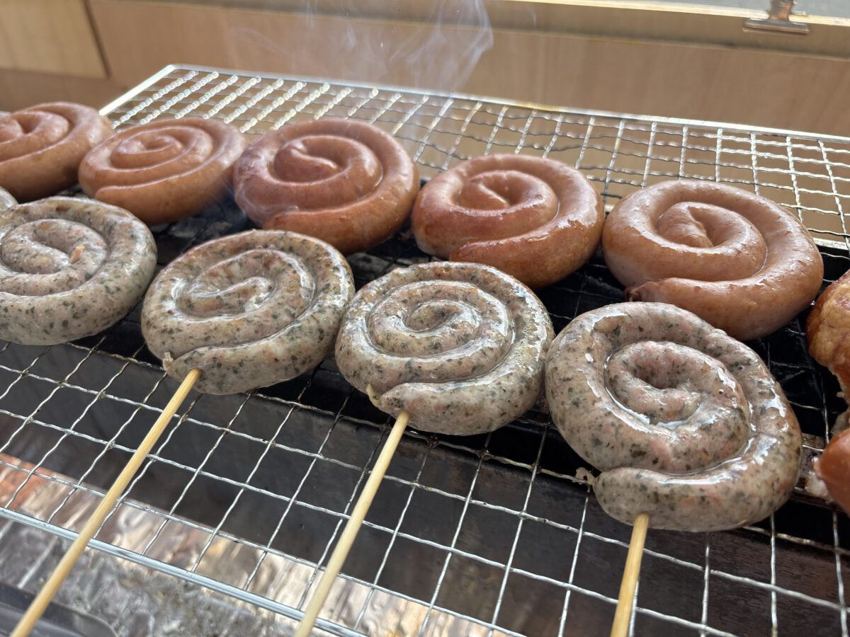 群馬県吾妻郡で東京農業大学時代の同級生が、安心・美味しく育てた豚肉を使わせていただき、しっかり塩漬け熟成・じっくり燻してハム&ソーセージを製造販売しております。関西蚤の市では2種類の異なる味のソーセージ「Wうずまきちゃん」を炭火焼きにて提供させていただきます。