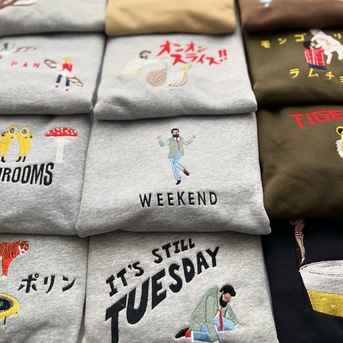 影響を受けたことや好きなもの、生活のワンシーンを題材に、クスッと笑えるユーモアと脱力感を心がけて刺繍を制作しています。2017年から制作を始め、イベント出店やネットショップ、委託販売など、関西を拠点に活動しています。万博記念公園では1年ぶりの出店となります。Tシャツ、スウェット、ニット帽、トートバッグ、サコッシュ、キーホルダー、ブローチ、ステッカーやマグネット……秋冬に活躍する商品もたくさん持っていきます。まるでテーマパークのようにワクワクする関西蚤の市で、皆様にお会いできるの楽しみにしています。