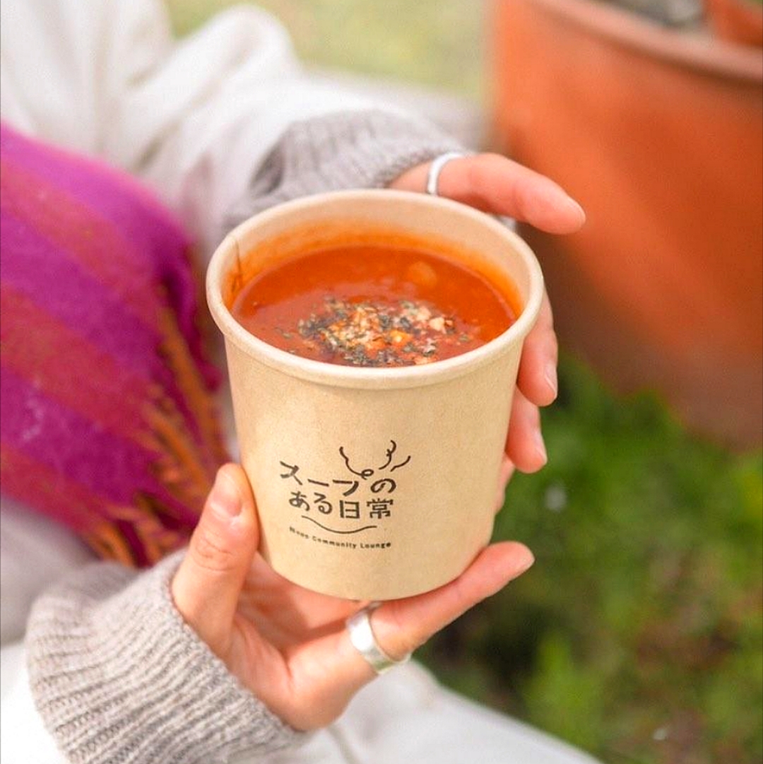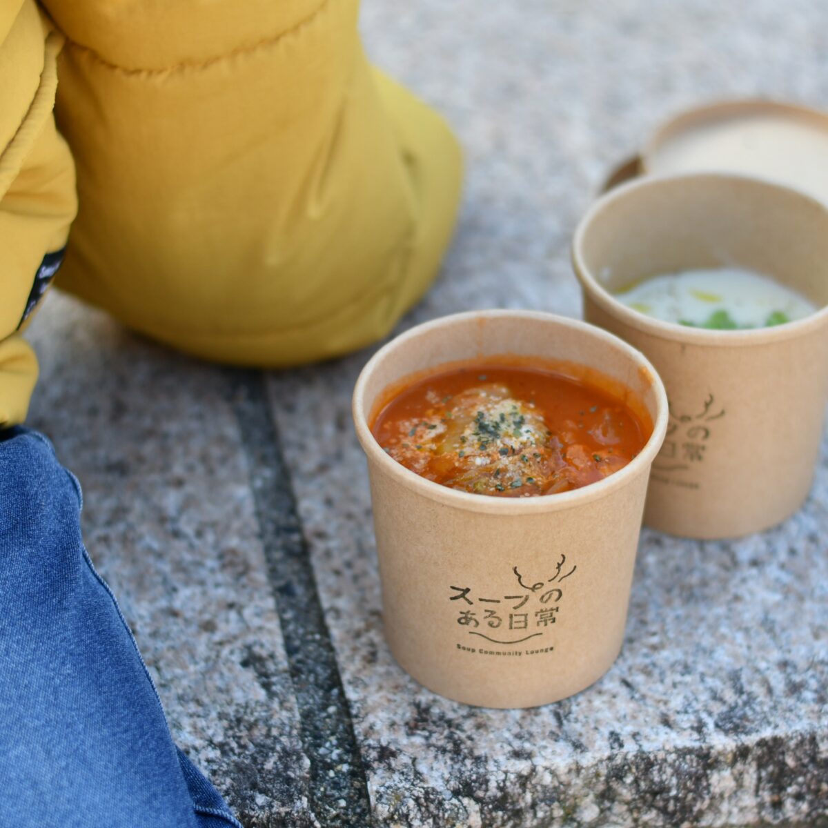 スープは片手で持ち運べるサイズ。スープを片手に温まりながら蚤の市を楽しんでくださいね。