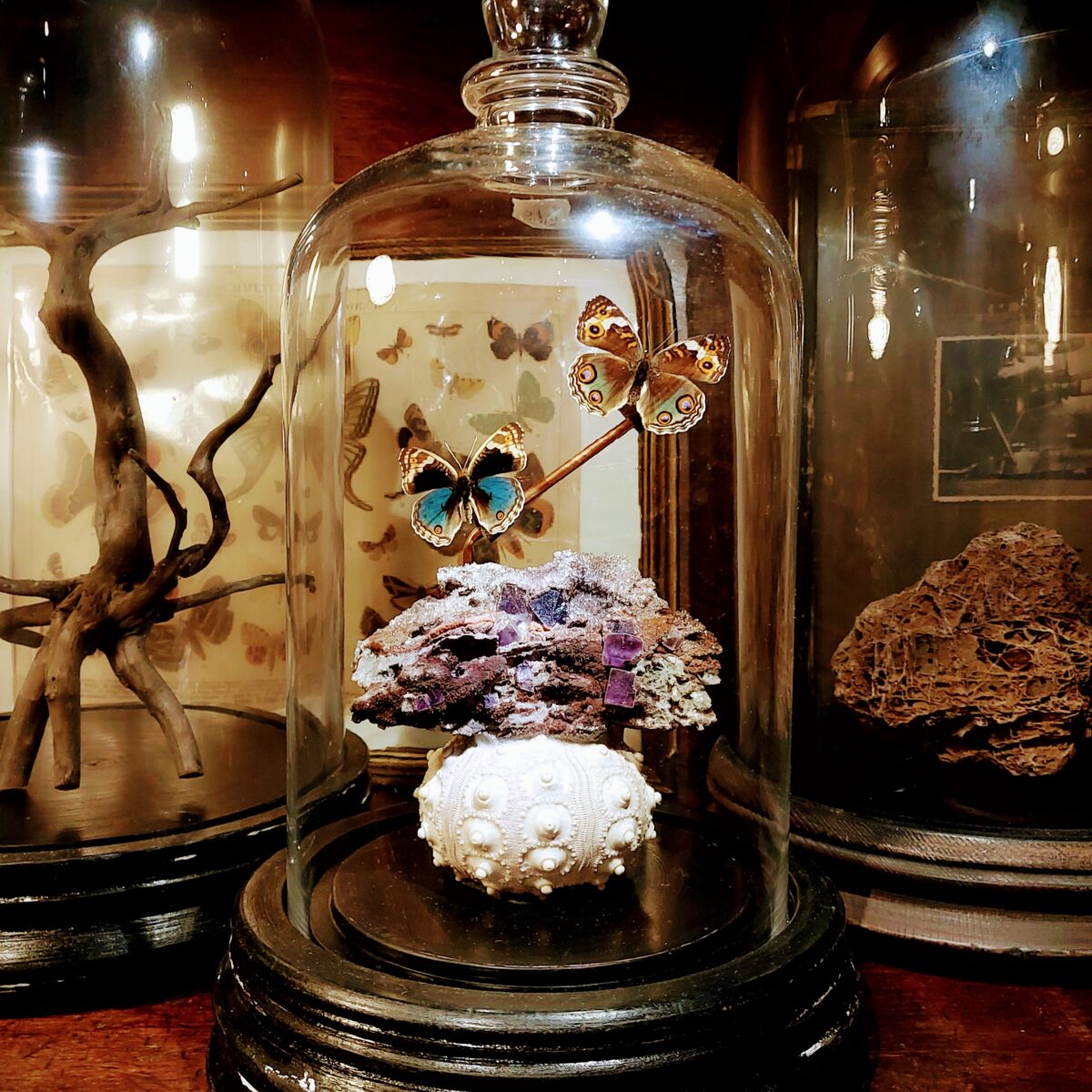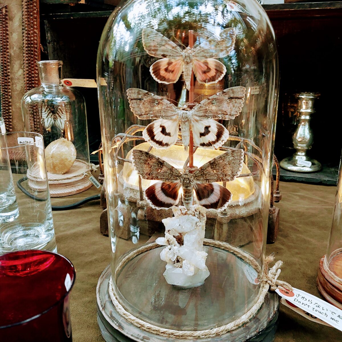 「鉱物と蝶の標本」輝く水晶、フローライトと小さな蝶が舞うガラスドーム。