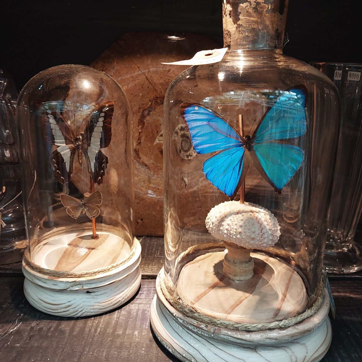 「蝶の標本」ガラスドームに収められたモルフォ蝶とアオスジアゲハの標本。