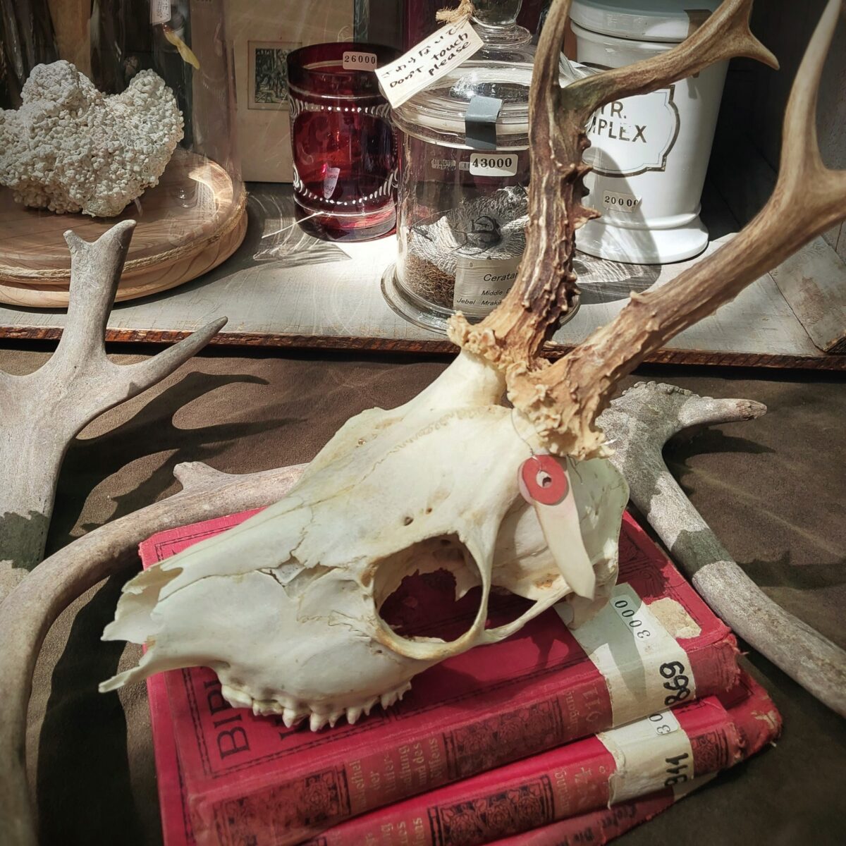 「鹿のトロフィー」狩りの証として飾られたノロジカの頭骨。