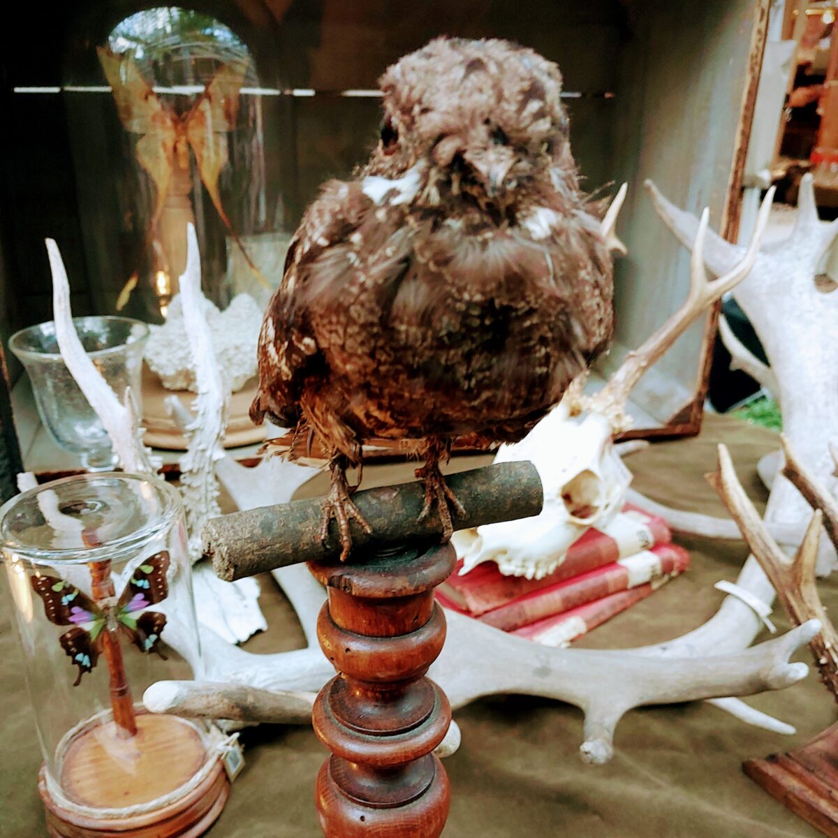 ガラスドームに閉じ込められた美しい蝶の標本や、19世紀に作られたモーゼル社のアンティークグラスを展示しています。蝶の標本は、小さな世界に色彩が舞い踊るかのようで、モーゼル社のグラスは天然水晶のような硬度と透明度、うっとりする輝きを放ち、ボヘミアンアンティークグラスの魅力を感じていただけます。また、紫外線を当てると蛍光色に光り輝くウランガラスは、世界中のコレクターを魅了しています。狩猟で仕留めた証であるハンティングトロフィーは、大型のムフロンの頭骨から小型の鹿まで、さまざまなサイズをご覧いただけます。