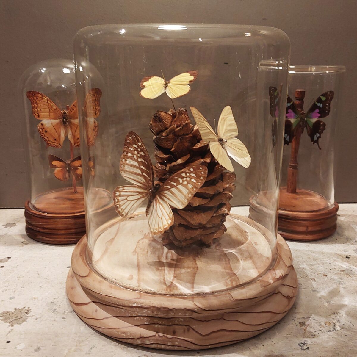 「蝶の標本」ガラスドーム内に舞う淡い黄色のキチョウたち。