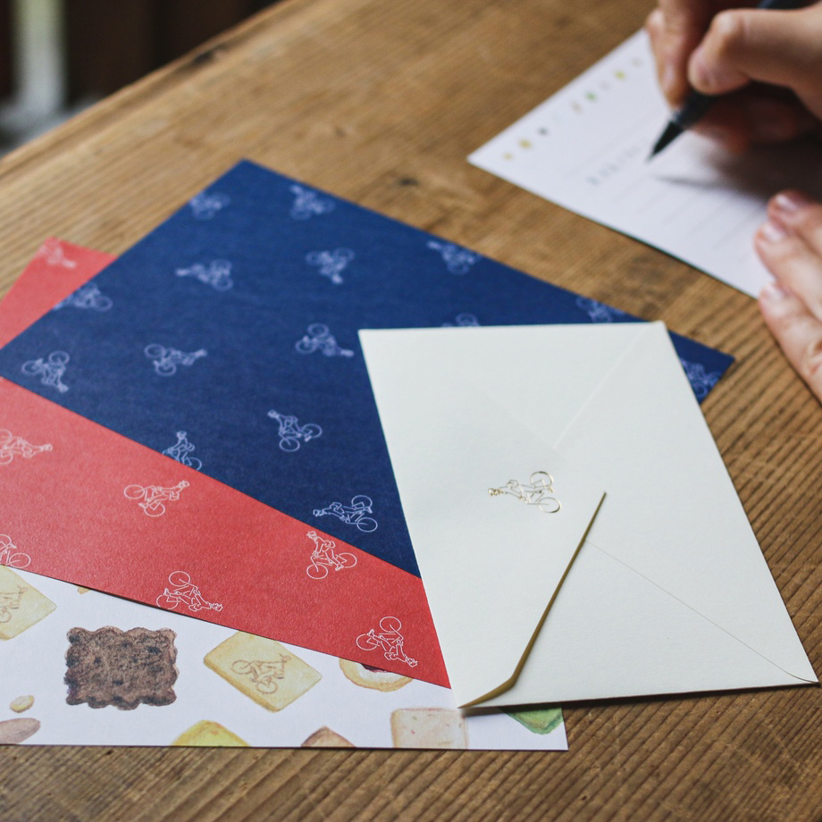 「オリジナルレターセット」朱缶、紺缶をモチーフに、TAYORIおじさんやクッキーのイラストが散りばめられた便箋と、箔押しのTAYORIおじさんがキラリと輝く封筒のセットとなっています。