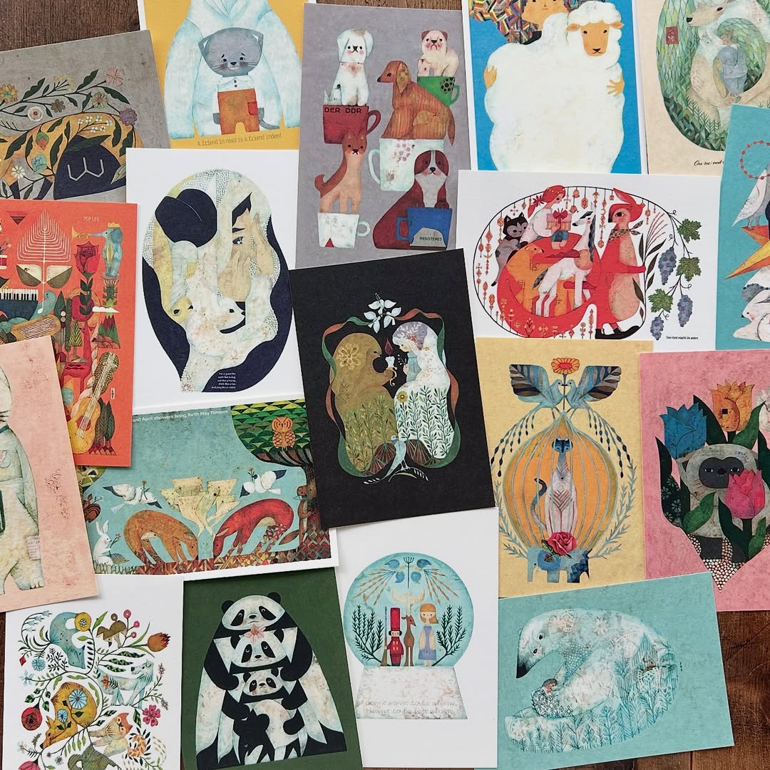 独創的なキャンバスに、ざらりとした絵肌を感じるイラストを描く福田利之。ずらりと並ぶポストカードから、お気に入りの一枚を見つけてみませんか?