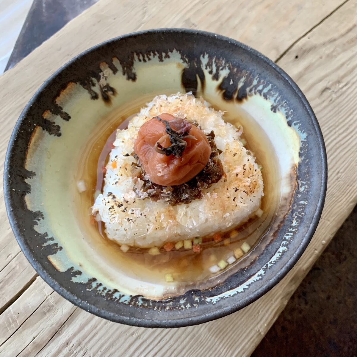 「南高梅と鰹のだし茶漬け」香ばしく焼き上げたおにぎりに、かつおと昆布のお出汁を合わせたほっこり温まるだし茶漬け