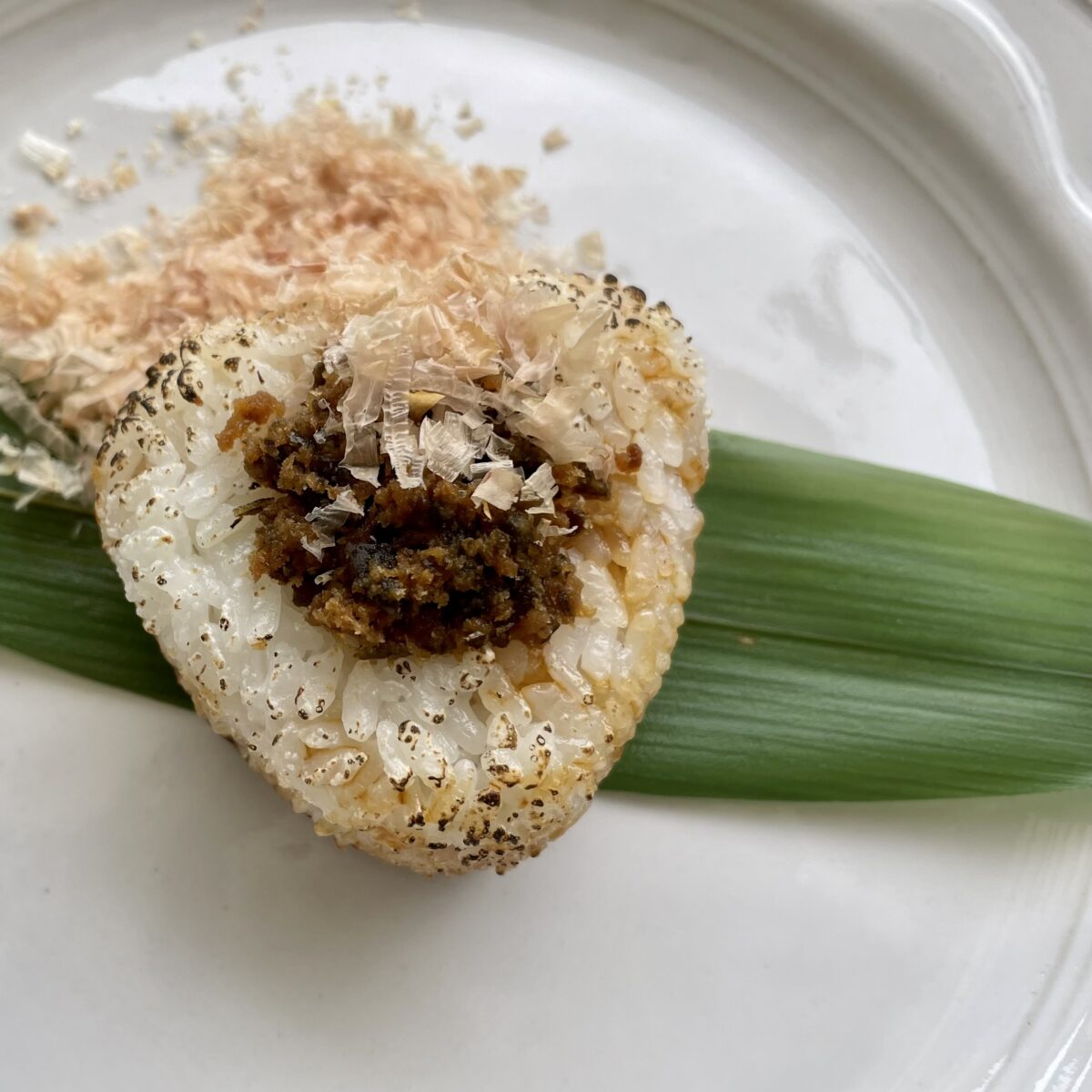 「本枯れぶし醤油の焼きおにぎり」醤油の香ばしい焼きおにぎりに伝統的な手火山製法で作られる志摩の本枯れかつお節をたっぷりと。