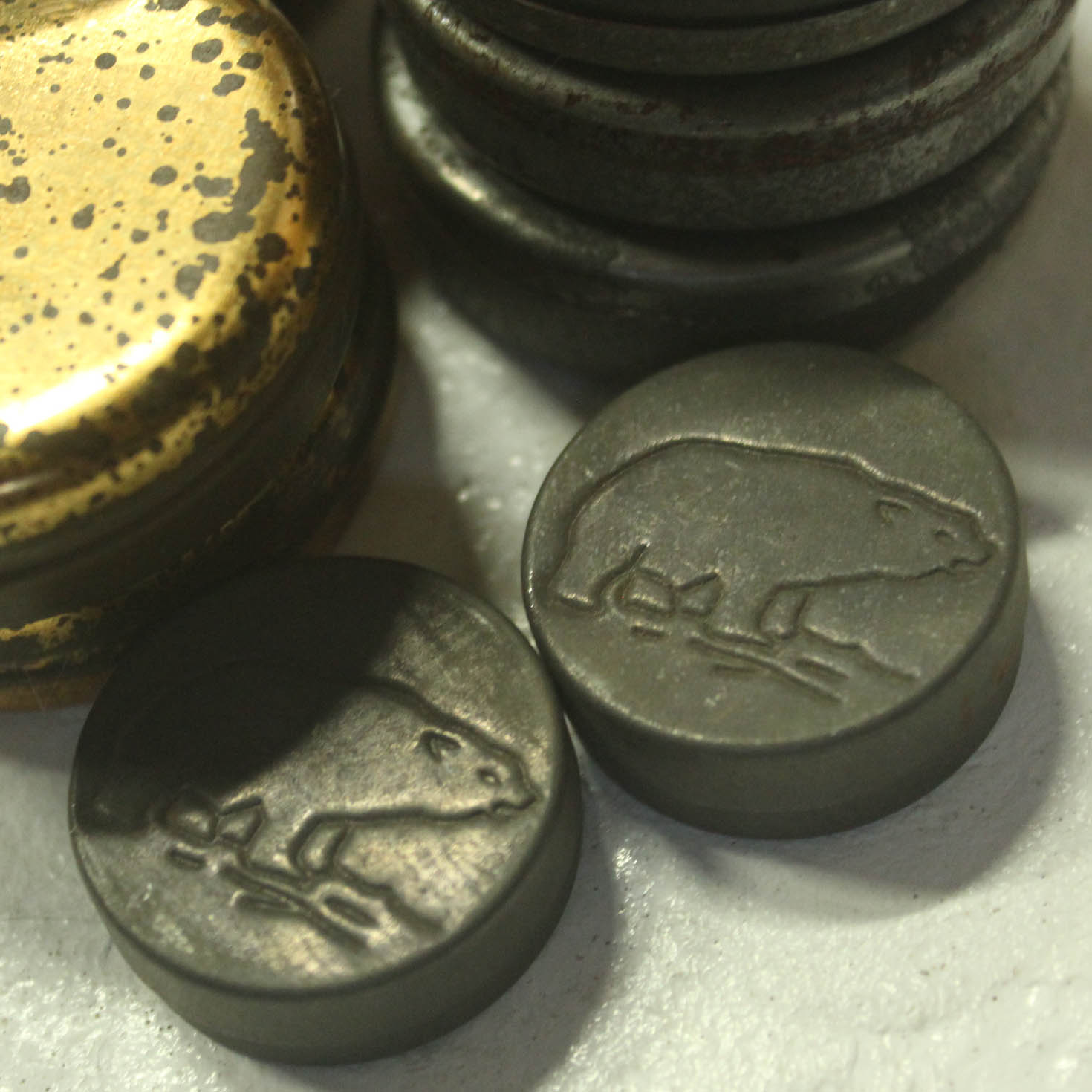 「缶」クマのエンボスや大小の円形の缶です。