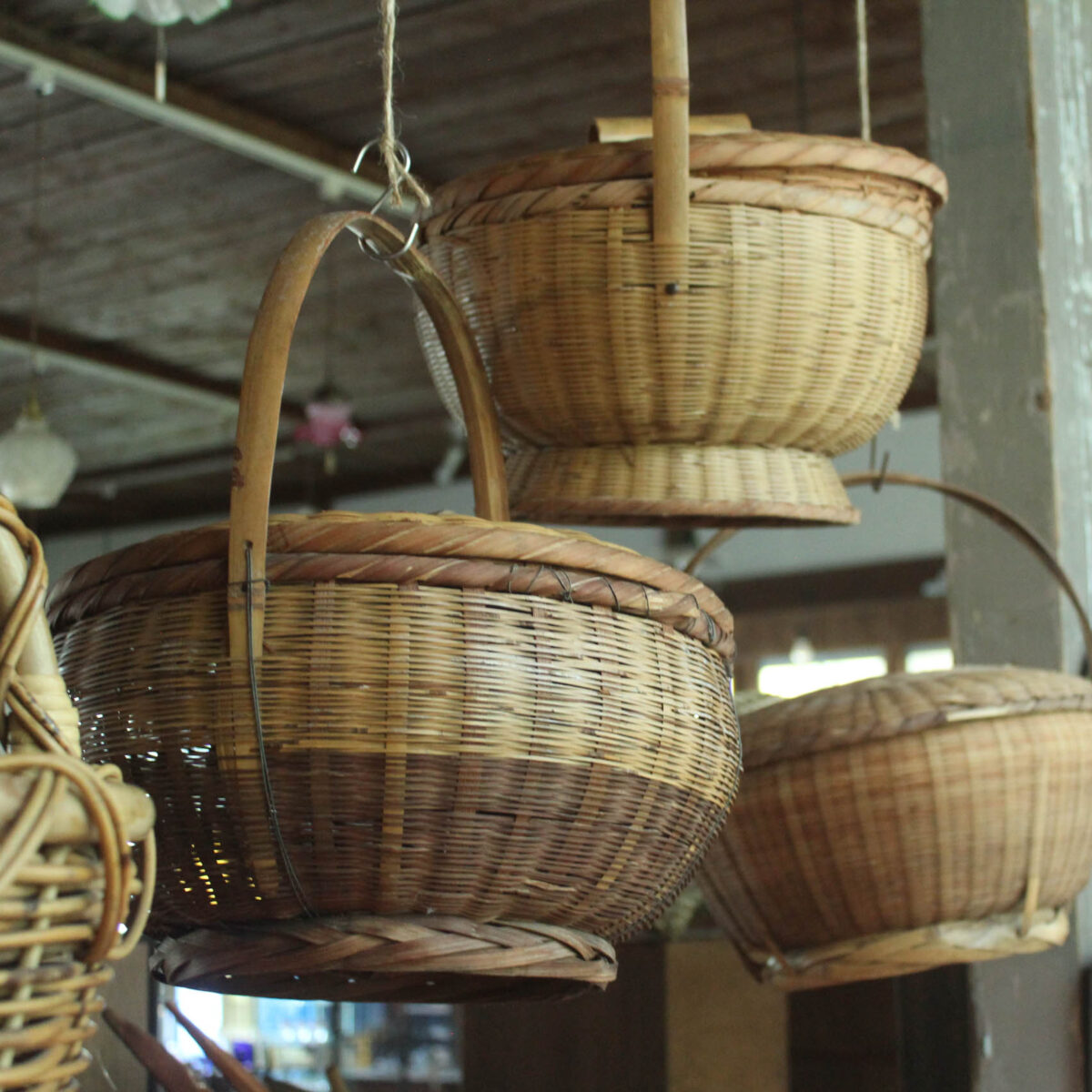 「かご」竹やラタンで編まれた籠もいろいろとご用意いたします。