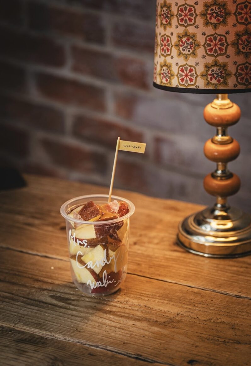 「無添加りんご飴」長野県から取り寄せた減農薬りんごとビート糖で作ったりんご飴を一口サイズにカットしてお渡しします。りんごの美味しさに心が躍るはず。