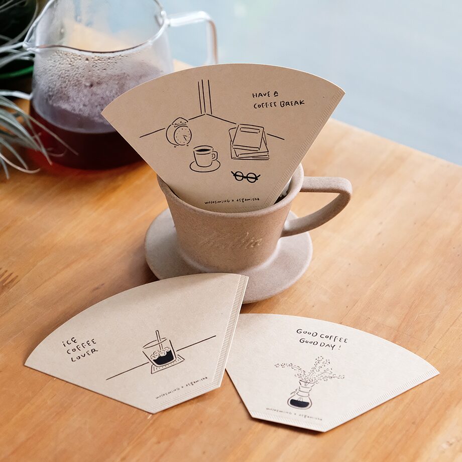 手紙社さんとコラボした「コーヒーフィルターカードセット」は、コーヒー好きの人にはたまらない、コーヒーフィルターの形をカードにしたアイデア商品です。厳選した日本紙は本物のコーヒーフィルターのような質感で、見た目だけでなく書き心地にも優れています。