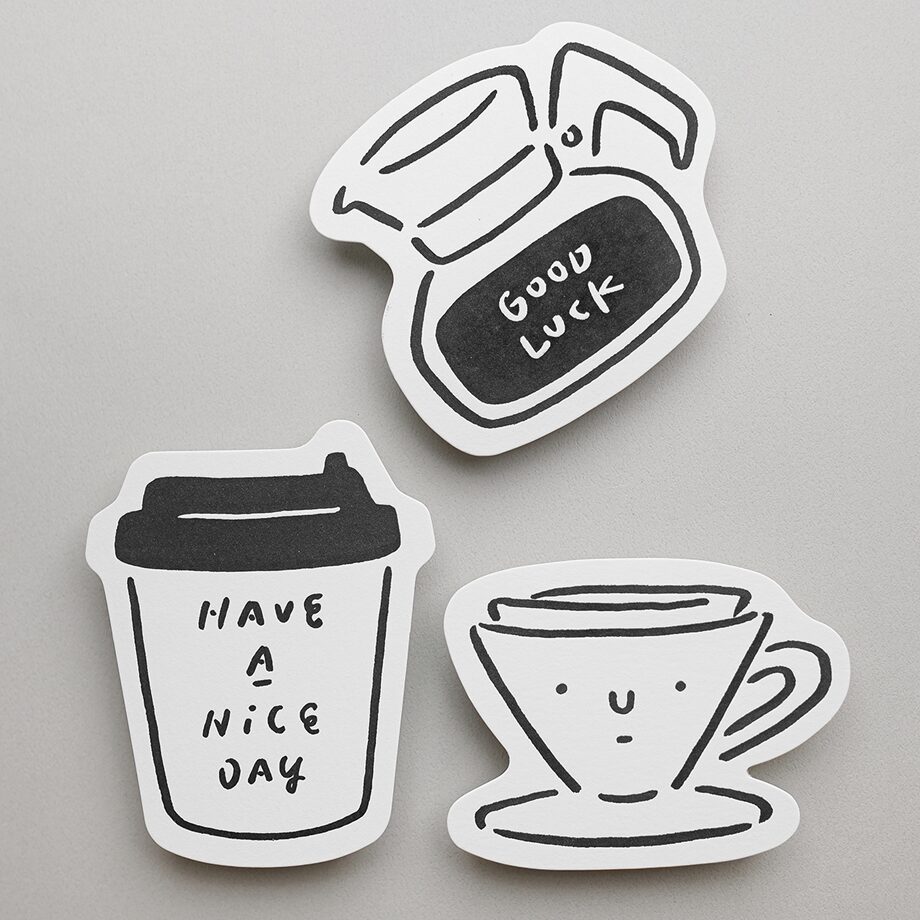 「LETTER PRESS COFFEE CARD」活版印刷のフォルムカード。紙は高ポンドのイタリア製で分厚い素材を使用。WHOSMiNGの活気に満ちた手描きのイラストと調和しており、レタープレスの凹凸な美しさをはっきりと感じられます。