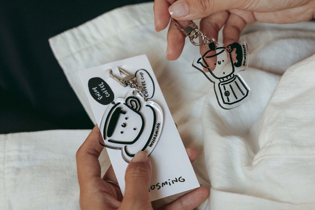 「かわいい表情のコーヒーカップとモカポットの透明キーホルダー」コーヒー好きにはたまらないアイテム。